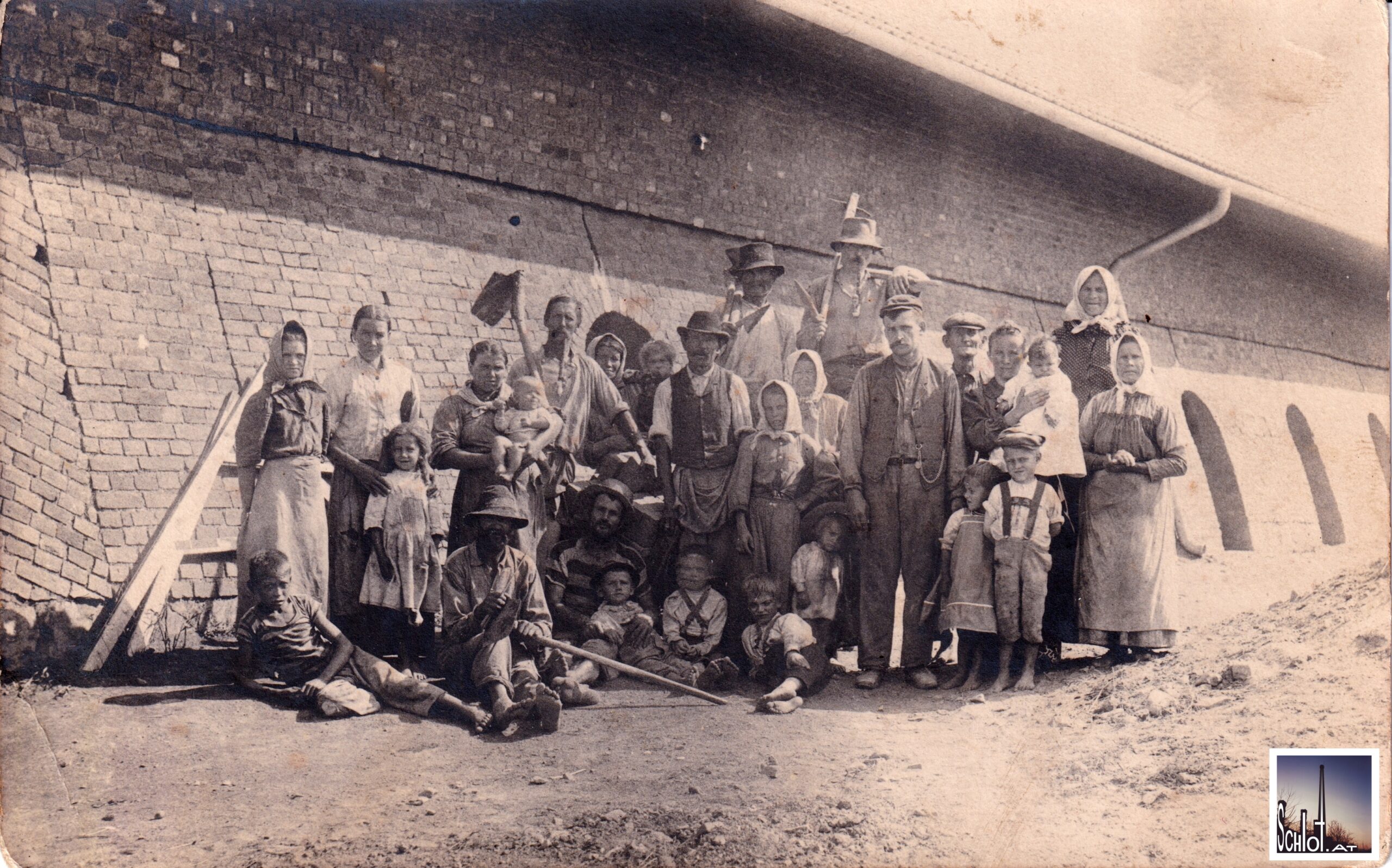 Foto [1] einer Partie von ZiegelarbeiterInnen vor einem Hoffmann’schen Ringofen. Zu erkennen sind neben einem Schuhe und Taschenuhr tragenden Aufseher bloßfüßige Männer, Frauen und Kinder, darunter mehrere Säuglinge.